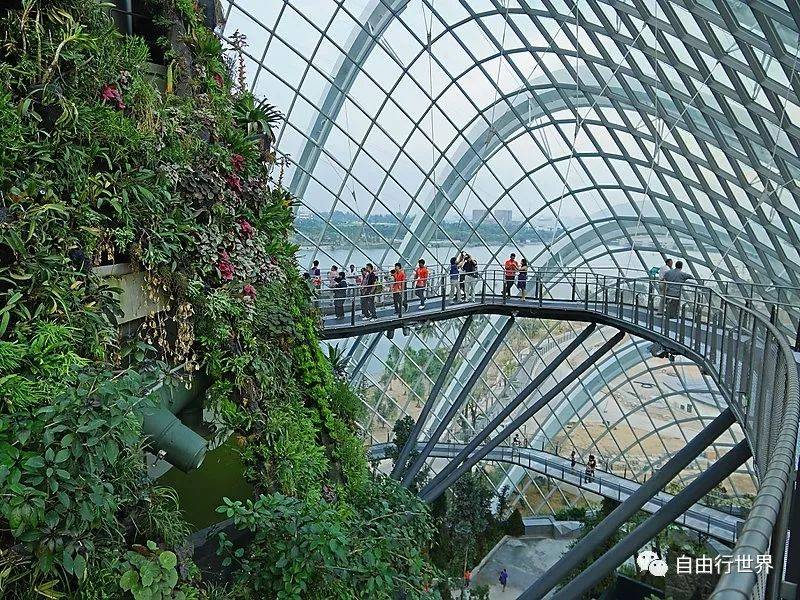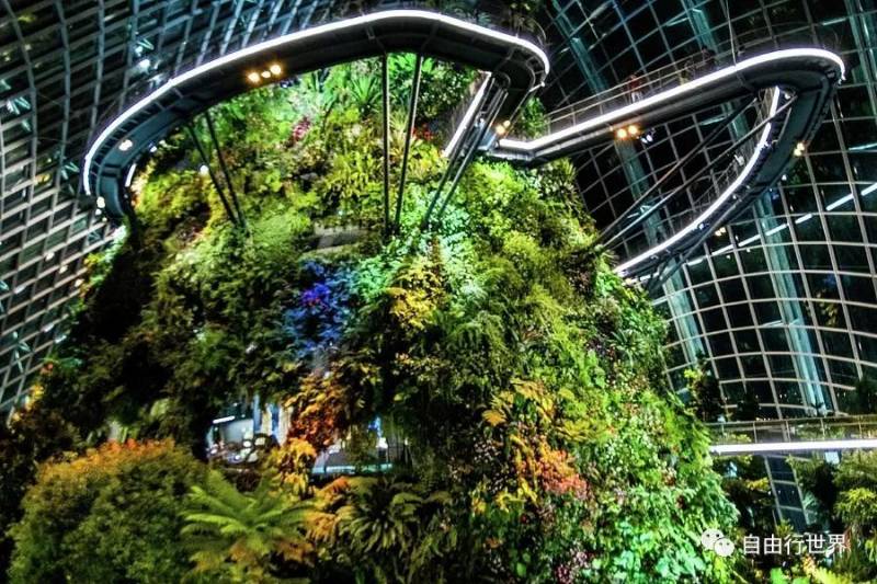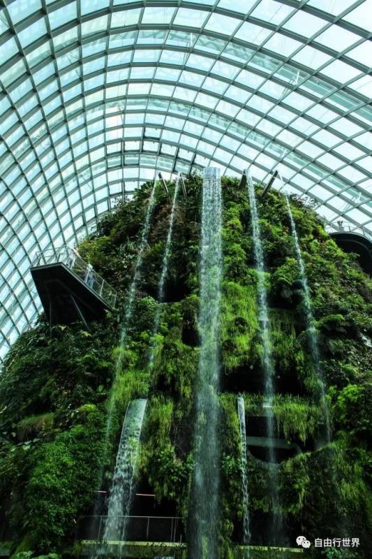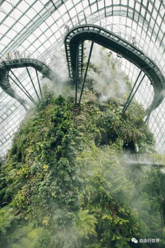 在玻璃暖房的正中间,是个巨大的云雾山,游客乘电梯到山顶,再绕着云雾山慢慢走下来,沿途观赏奇妙的植物和景观。从山顶还有35米高的瀑布直贯而下,给游人带来丝丝的凉意。