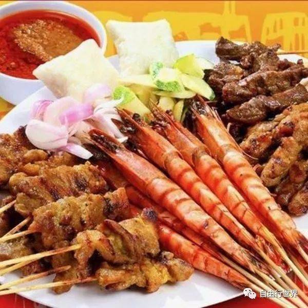 烤肉先用含姜黄的酱汁腌过,鸡肉、猪肉、牛肉、羊肉或各种虾和鱼肉串成串,在炭火上烧烤。最特别的是烤肉蘸的沙爹酱,一般是辛辣的花生碎沾酱,独特的花生香气中略带甜味,相当有特点。因为沙爹的地方特色,新加坡航空公司的公务舱也会提供沙爹肉串作为开胃菜。