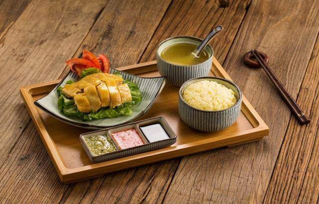 它的做法其实很简单:鲜嫩多汁的白斩鸡,用鸡汤烹煮成的香米饭,加入几片香兰叶增添香味,蘸着浓稠的黑酱油和特制姜蓉辣椒酱吃。