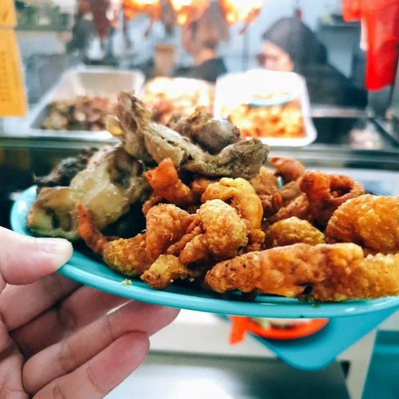 这个档口的马来美食特别诱人,基本所有食物都充满了金黄的诱人的颜色。马来美食中鸡肉式最常见的,很少看到鸭。