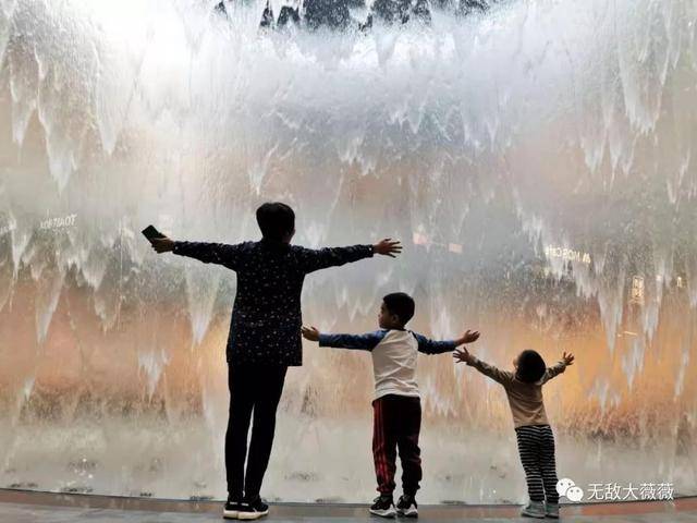 先先和后后两个小孩围着瀑布的玻璃打转,各种奔跑欢笑。