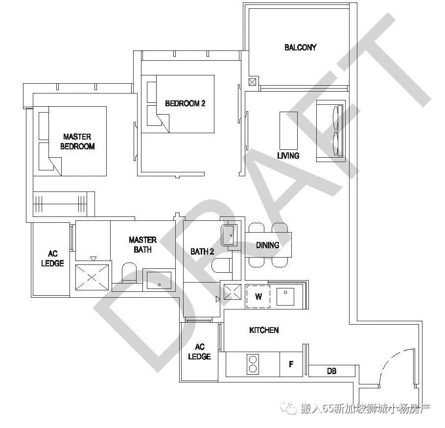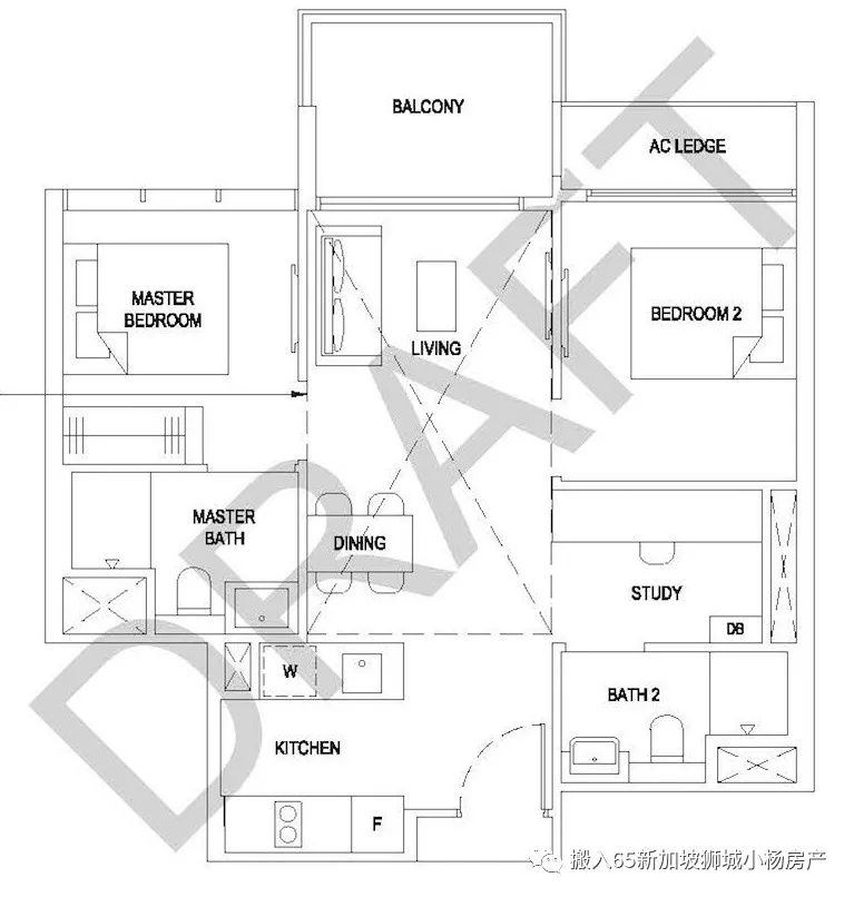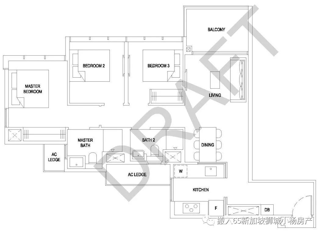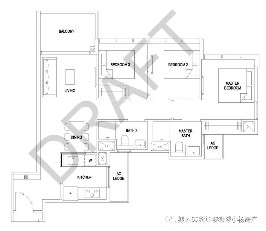 3房户型1- 价格新币 S$1,315,000 起户型 3C3- 3室 2厅2厕926sqft= 86平方米25% 首付:S$328,75075% 贷款:S$986,25030年贷款,2%利息月供:S$3645