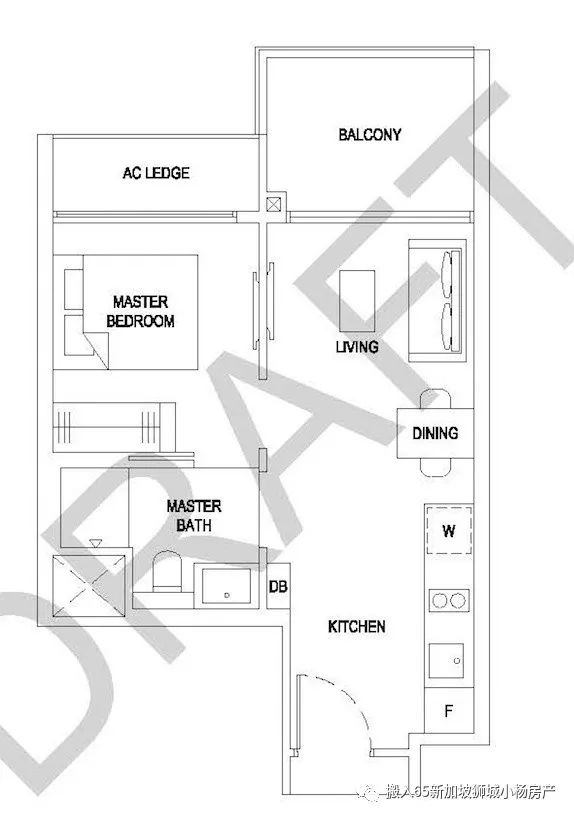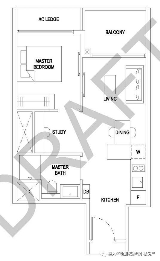 1房户型2- 价格新币 S$731,000 起户型 1B1 - 1室 1厅 1厕474sqft= 44平方米25% 首付:S$182,75075% 贷款:S$548,25030年贷款,2%利息月供:S$2026