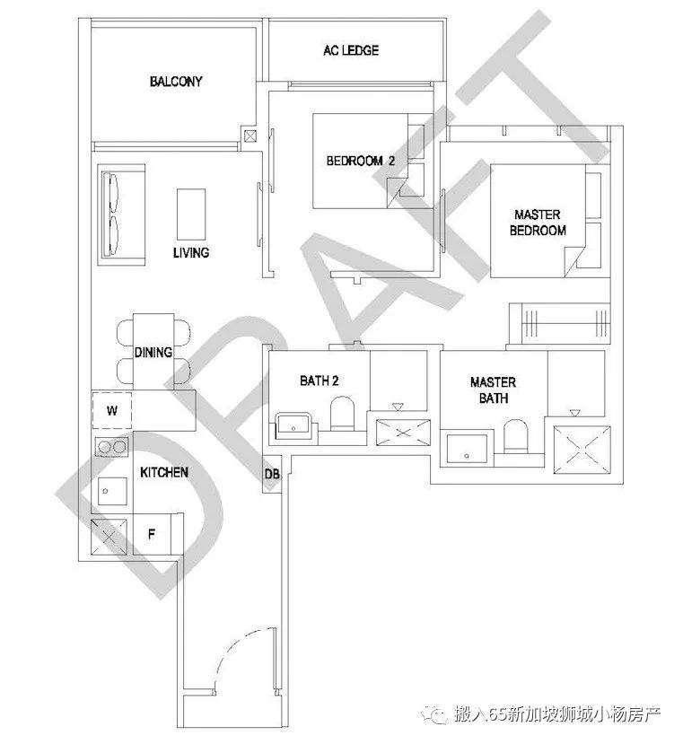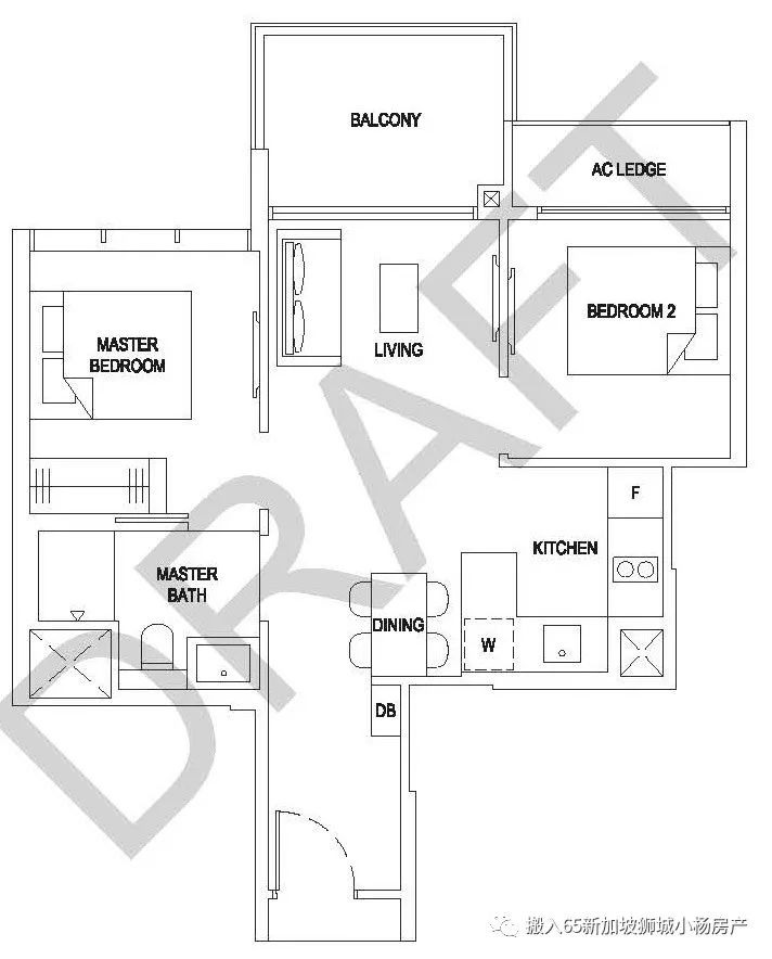 2房高端户型1- 价格新币 S$986,000 起户型 2D3 - 2室 2厅 2厕667sqft= 62平方米25% 首付:S$246,50075% 贷款:S$739,50030年贷款,2%利息月供:S$2733