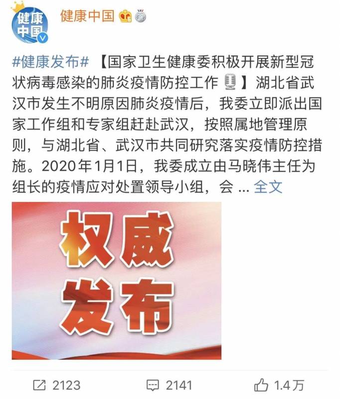 “湖北省武汉市发生不明原因肺炎疫情后,我委立即派出国家工作组和专家组赶赴武汉,按照属地管理原则,与湖北省、武汉市共同研究落实疫情防控措施。”