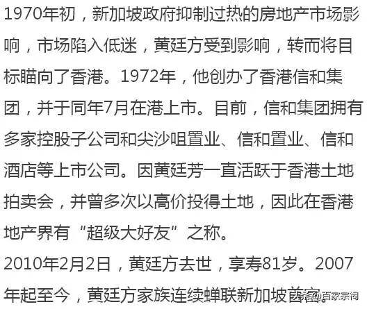 香港一役,获利颇丰,黄廷芳不久就把黄氏家族在香港的经营管理权,全权交给长子黄志祥,就是今天家族企业旗下的香港“信和系”版图。90年代后,他又把黄氏家族在新加坡的经营管理权交给次子黄志达,也就是今天的远东机构旗下产业板块。