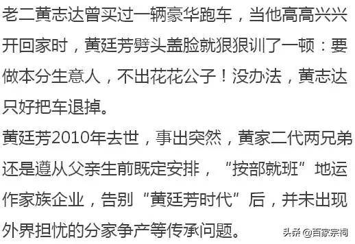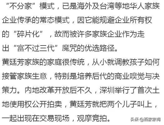 自第一代创始人黄廷芳于2010年去世后,家族企业就由黄氏两兄弟分别执掌,在传承方面曾一度引发外界的质疑。如今,黄廷方孙女、黄志祥的长女黄敏华等家族第三代成员,已被推到了台前,续写着首富家族“富过三代”的传奇故事。