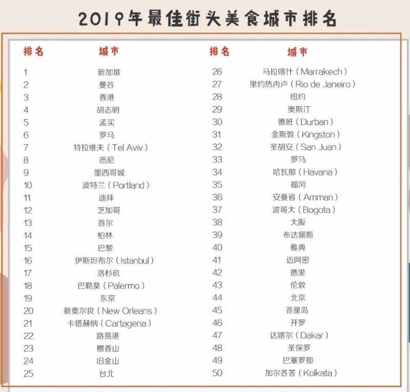 从2019年7月18日至9月19日,《CEOWORLD》对86个国家和地区进行了为期3个月的调查,通过4个参数排名:街头食品供应商数量、性价比、街头食品体验次数和食品卫生,来评定最佳街头美食城市,最终新加坡荣登“2019全球街头美食爱好者选出的50佳城市”的榜首。
