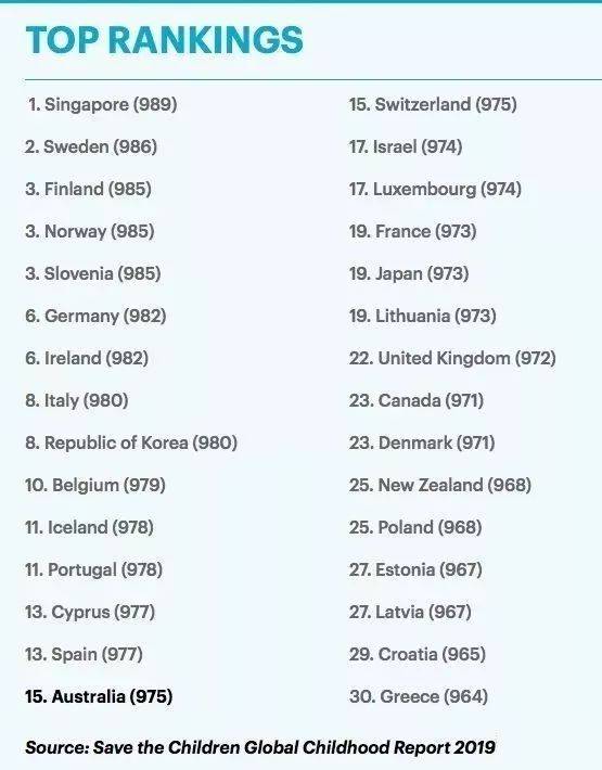根据国际非政府组织“救助儿童会”(Save the children)于2019年发表的的最新的年度报告显示,新加坡是世界上最适合儿童成长的国家。