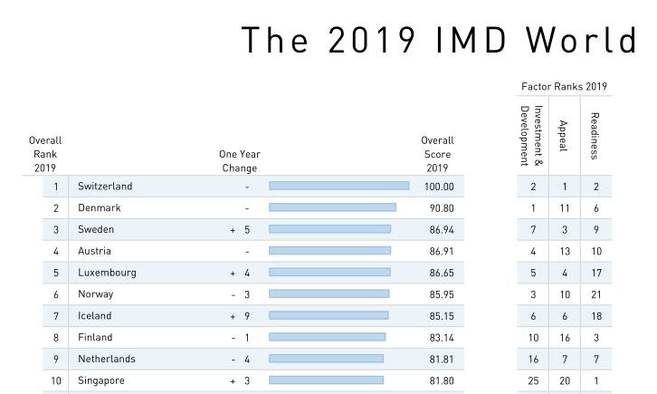 瑞士洛桑管理学院(IMD)于2019年11月18日公布《2019世界人才报告》。新加坡跃升至全球第十名,比去年提高三个了档次。同时也是亚洲唯一进入前十的国家。
