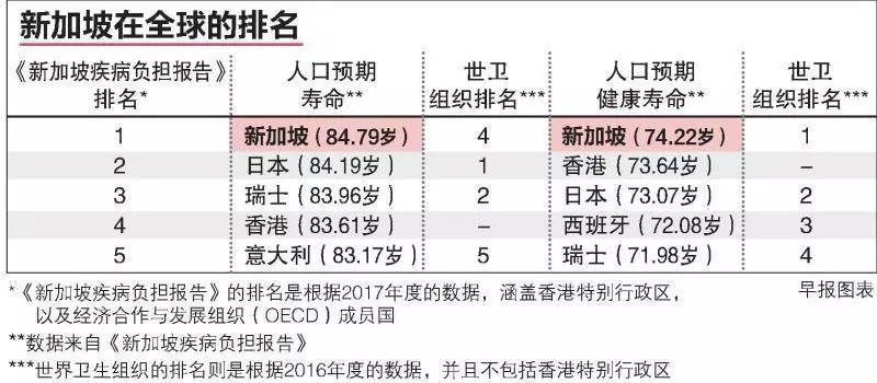 由卫生部和华盛顿大学卫生统计评估研究所合作撰写的报告显示,新加坡人的预期寿命不仅居全球之首,不被疾病缠身的预期健康寿命也是全球之冠。根据报告,1990年至2017年,国人出生时的预期寿命(life expectancy)延长了8.7岁,达84.8岁,是世界各国中最高的。