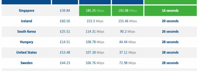 新加坡目前是全球网速最快的地方,平均下载速度为185.25 Mbps。冰岛平均下载速度为153.3 Mbps,排在第二,韩国平均下载速度为114.31 Mbps,排第三,排在最后一名的是文莱,仅为15.1 Mbps。