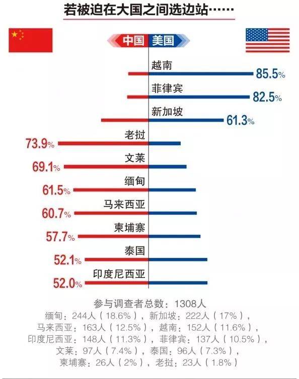 东南亚十国共1308人在去年11月中至12月初参与这项网上调查。其中四成是政府与跨政府机构,以及国际机构的官员,另36.2%来自学术界,其余来自商界与传媒界。参与调查者中,缅甸、新加坡与马来西亚籍人数最多。