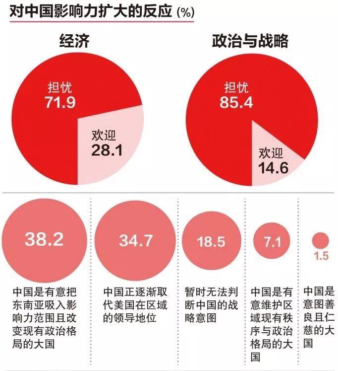 这种不安与担忧,来自东南亚民众对中国目的的怀疑——85%的受访人对中国的政治战略扩张和膨胀感到担忧和疑虑,而72%的受访者则认为中国的经济影响力扩张很快,对此表示担忧。
