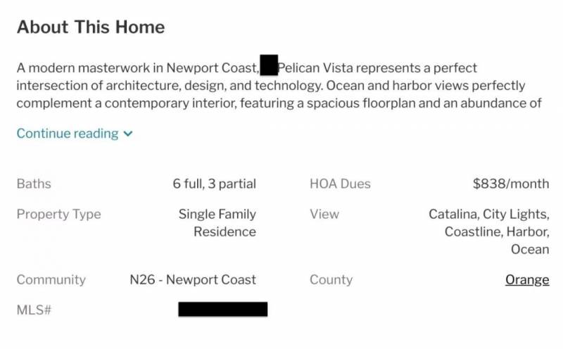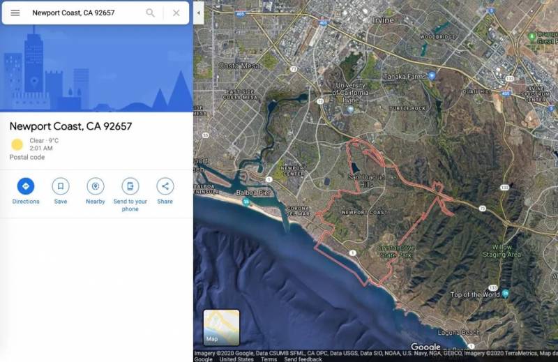 目前,暂时无法使用第一种方法去对应女主炫富的照片,但她这个情况非常适合用第二种方法,因为其定位已经将查询目的地缩到一个相当小的范围,即Newport Beach的Newport Coast,这是一个范围很小,人口不到一万的一个地区,而且区域内有不少山地,房产数量少但总价高,要找到具体是哪一套房,一点也不难。