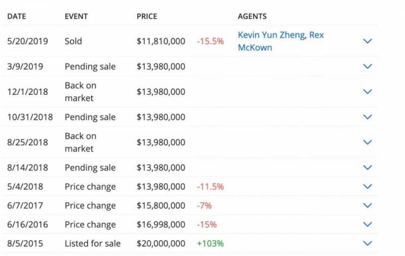 由下图的信息可知,这套房原业主在2015年8月5号就挂牌出售了,挂牌价2000万美元,后来经过多次降价(高总价房产往往需要大幅折价后卖出),到2018年8月14日才pending sale(意思是待批,完成交易前的最后状态)。