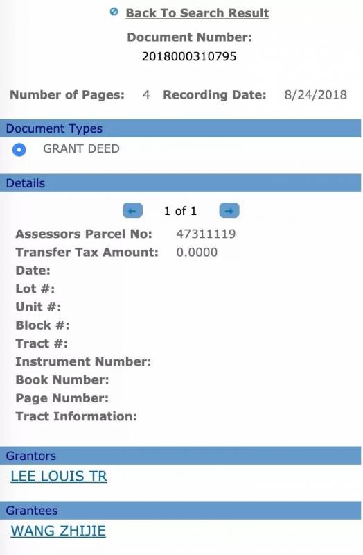 在2018年,这套房并非像房产交易平台说的那样没有交易,房子的产权在2018年8月24日从一家名为Lee Louois的信托转至一位名为Wang Zhijjie的人名下,而这条记录上的Parcel Number(可以理解为房产识别号码)和上文展示的房产完全一致。