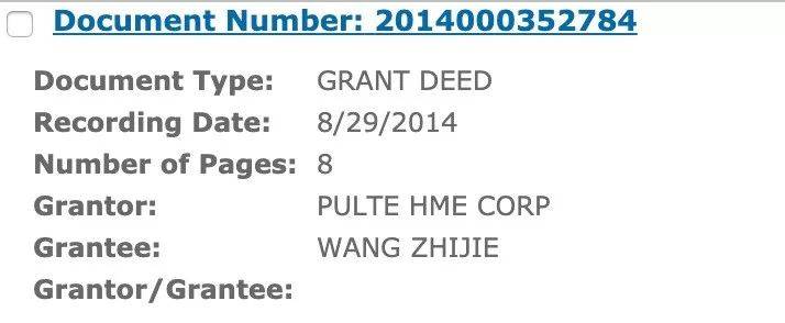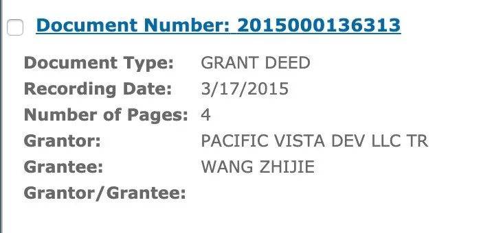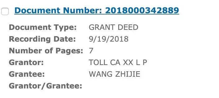 加州橙县更多的文件证明,Wang Zhijie在加州所购买的房产远不止故宫女主这一套,我们可查到其作为Grantee的三个Grant Deed(房产交易记录),三个文件证明其在2014年8月29日、2015年3月17日、2018年9月19日都在当地买入了房产。而橙县只是大洛杉矶地区的一个县,洛杉矶又只是美国众多大城市的一个而已。