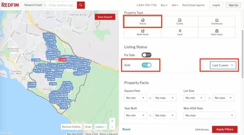 我们开始吧,打开Redfin,这是美国最大的房地产网站之一,所有数据应有尽有。搜索Newport Coast, Newport Beach, CA。选择只显示Sold的房源(已售出房源),范围定位过去两年,然后考虑到其晒出的照片是独立屋,所以在Property Type这一选项中选择仅显示Houses(独立屋),这样一来,我们的搜索范围就越来越小了。