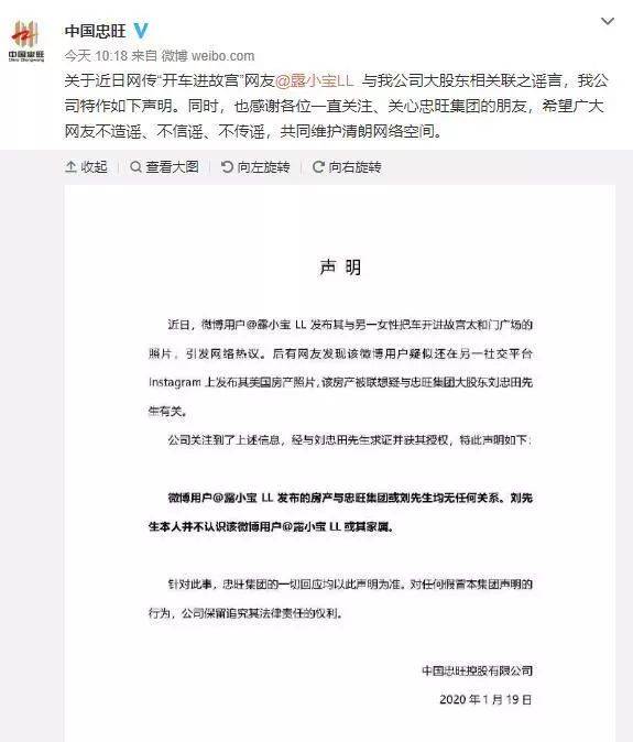 最新情况,忠旺集团也针对豪宅作出回应称:经与刘忠田求证并获其授权,特此声明,微博用户@露小宝LL 发布的房产与忠旺集团或刘先生均无任何关系,刘先生并不认识微博用户@露小宝LL 或其家属。