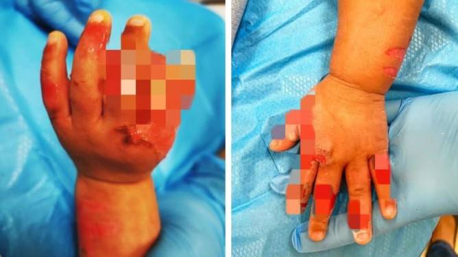 刘美良提供的照片显示,就医时,女儿左手的五根手指都是肿胀发红的,手掌、手背和手腕有多处伤口。
