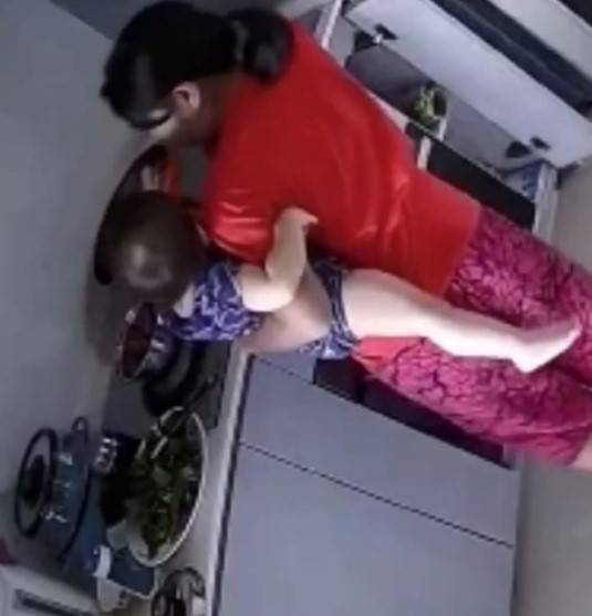 电眼画面显示,身穿红衣红裤的女佣左手抱着女童站在灶台前,右手拿着锅铲在锅中翻炒,随后放下锅铲,握起女童的左手,让她去碰刚刚炒菜的锅。