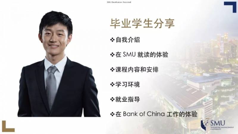 在第二个部分,2019届校友吴海勍同学为大家带来了他在 MSFE 就读的经验分享。 首先是在 SMU 的就读体验,其中包括课程内容及安排和学校环境两个方面。丰富的课余生活和优美的校园环境,为学生打造出良好的学习氛围。他建议同学们在学习的时候一定要明确自己的需求,积极把握自身优势。 除此之外,吴海勍学长还着重介绍了关于学校专业就业指导以及在中国银行的工作体验,他表示非常感谢 SMU 提供的中国银行实习机会,通过专业知识的线下实际运用以及实习过程中掌握的知识技能,为他之后的工作奠定了扎实的基础。 最后,吴海勍同学鼓励同学们都来到 SMU 就读 MSFE 课程,为自己的人生添上浓墨重彩的一笔。
