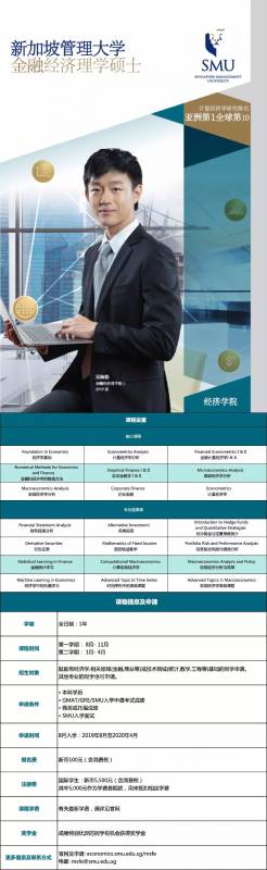 作为新加坡管理大学经济学院的两项专业研究生课程之一,MSFE 以高水准的学术内容,向同学们传授经济学、计量经济学、金融市场运作的知识,以及如何将经济学和计量经济学中最先进的工具应用到金融领域。基于原有的多学科优势、学院和大学的强大师资、独特的城市校园、丰富的行业资源,MSFE 课程能够为学生提供独特的“转型”学习体验,并为有志于走向市场的专业人才提供加速砝码。