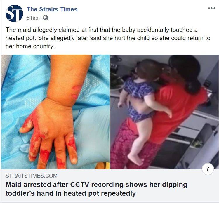 全岛轰动!新加坡女佣把17个月大孩子的手插到滚水里
