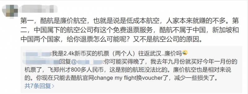 有网友解释,酷航即是廉航又不隶属中国,退票事宜恐难实现。也有网友忿忿不平,酷航票价高企,名不副实。