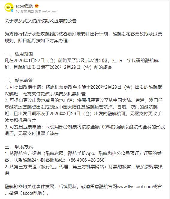 接到网友投诉后,新加坡眼已咨询酷航相关事宜。酷航今天也在官方微博上发布了通告。据酷航公告显示,凡在指定的日期内购买了涉及武汉航线的旅客可以享有酷航的豁免政策。