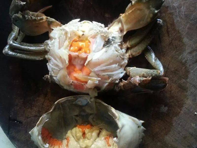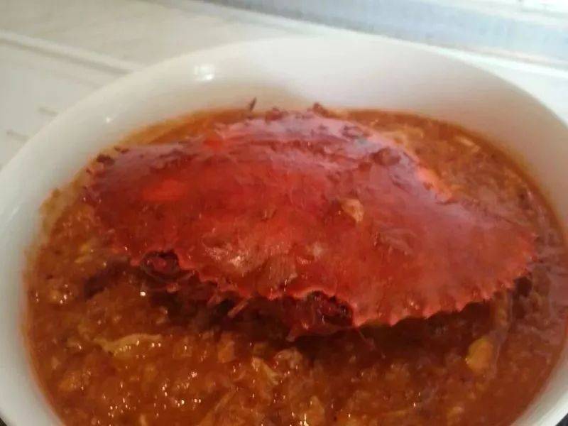 盛起螃蟹装盘,留下酱汁在锅中,酱料中直接打入鸡蛋,打入后朝同一个方向缓慢搅拌(辣椒螃蟹的灵魂操作)。将完成的酱料淋在螃蟹上,最后再盖上蟹壳,辣椒螃蟹大功告成。