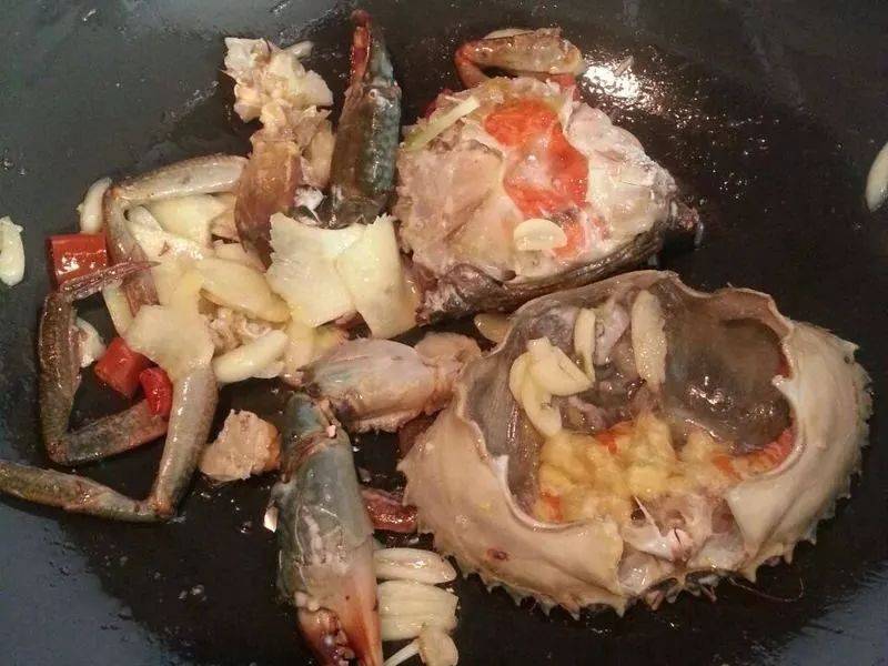 放入螃蟹翻炒约10分钟,等螃蟹都变红之后,下洋葱再炒5分钟,此时可以把焦黑的姜片和蒜瓣挑走不用。下番茄酱、蒜蓉辣酱翻炒,依个人喜好程度加酱油、盐、糖、鸡汤粉并且试味,视浓稠程度再加水。