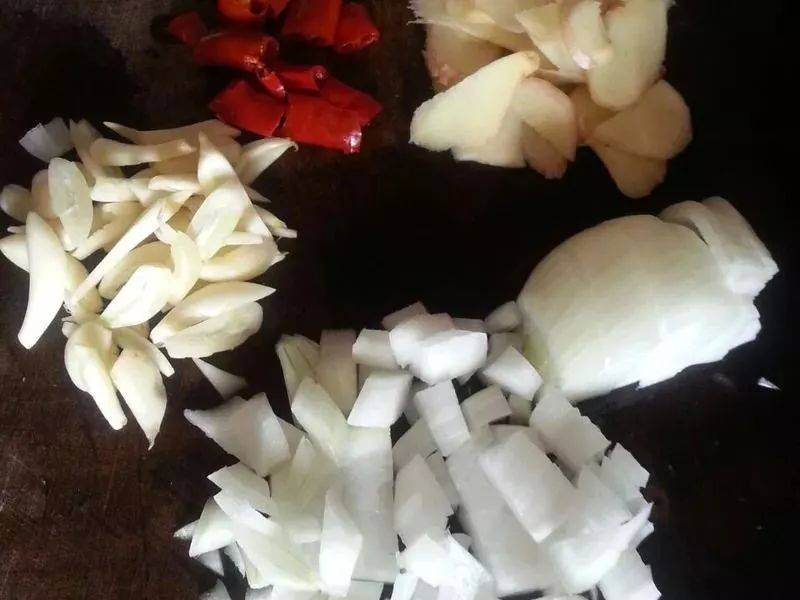 热油锅(炒菜用油的两倍),下姜片、蒜瓣,喜欢吃辣的可再加点辣椒。