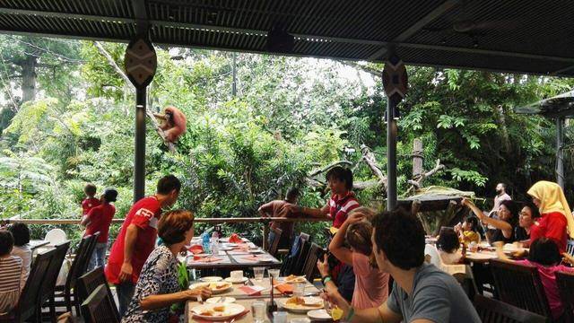 如果你时间充足,那么建议你住在动物园的周边,第二天一早可以去体验动物园的野趣早餐,游客在吃早餐的时候可以让红毛猩猩陪伴,这种体验在每天的9:00-10:30左右,费用在35新币,儿童25新币。除此之外,在园区的入口处也有很多的美食店铺,他们提供冰激凌、肯德基等。