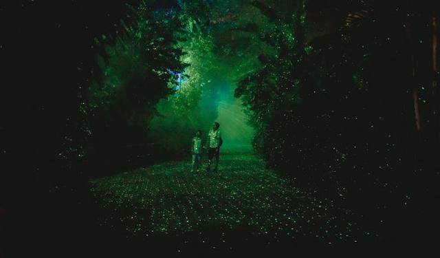 在一路的体验中还会有音乐伴随,脚下的光线会引导大家向前,神秘的音乐,昏暗的灯光效果,雨林中飘散的雾气等,好有仙境啊。当我们穿过小桥,来到森林里的时候,会看到迎面飘来的萤火虫,树上,地上全都是,有人甚至用手去摸。