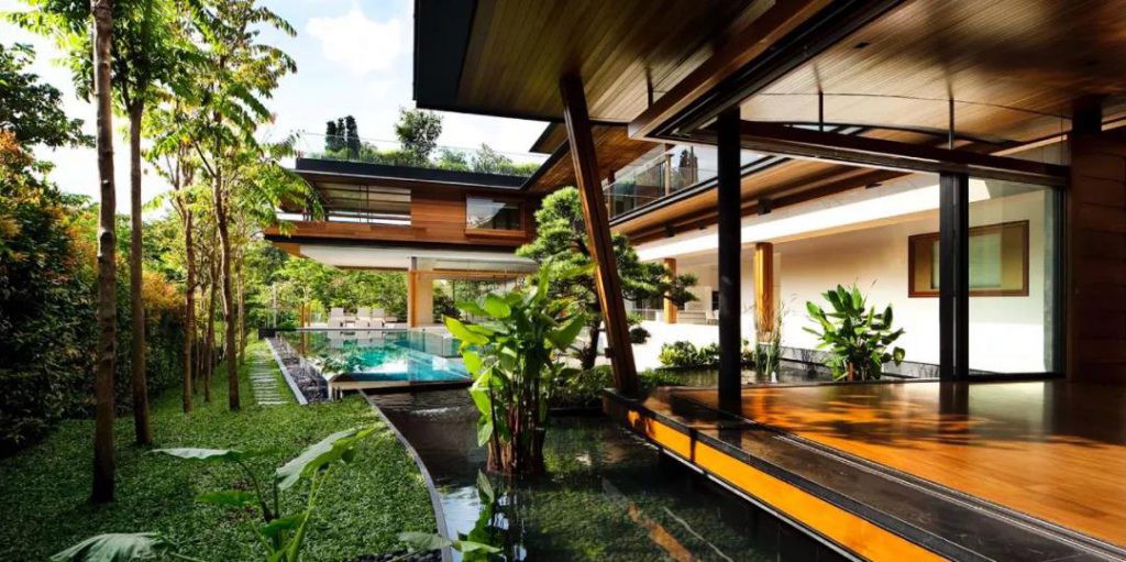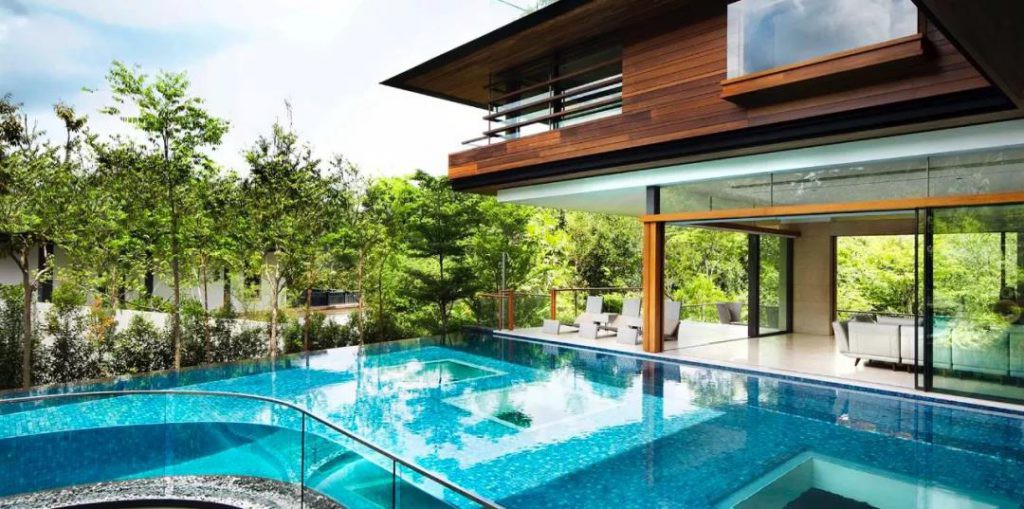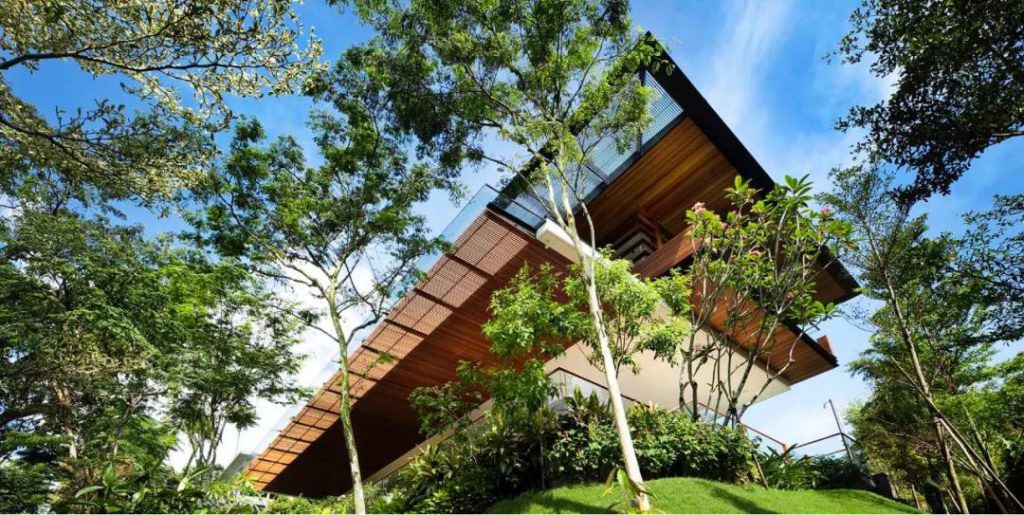 这栋别墅在新加坡植物园附近,面积达到1,402.8平方米,并且拥有永!久!地!契!