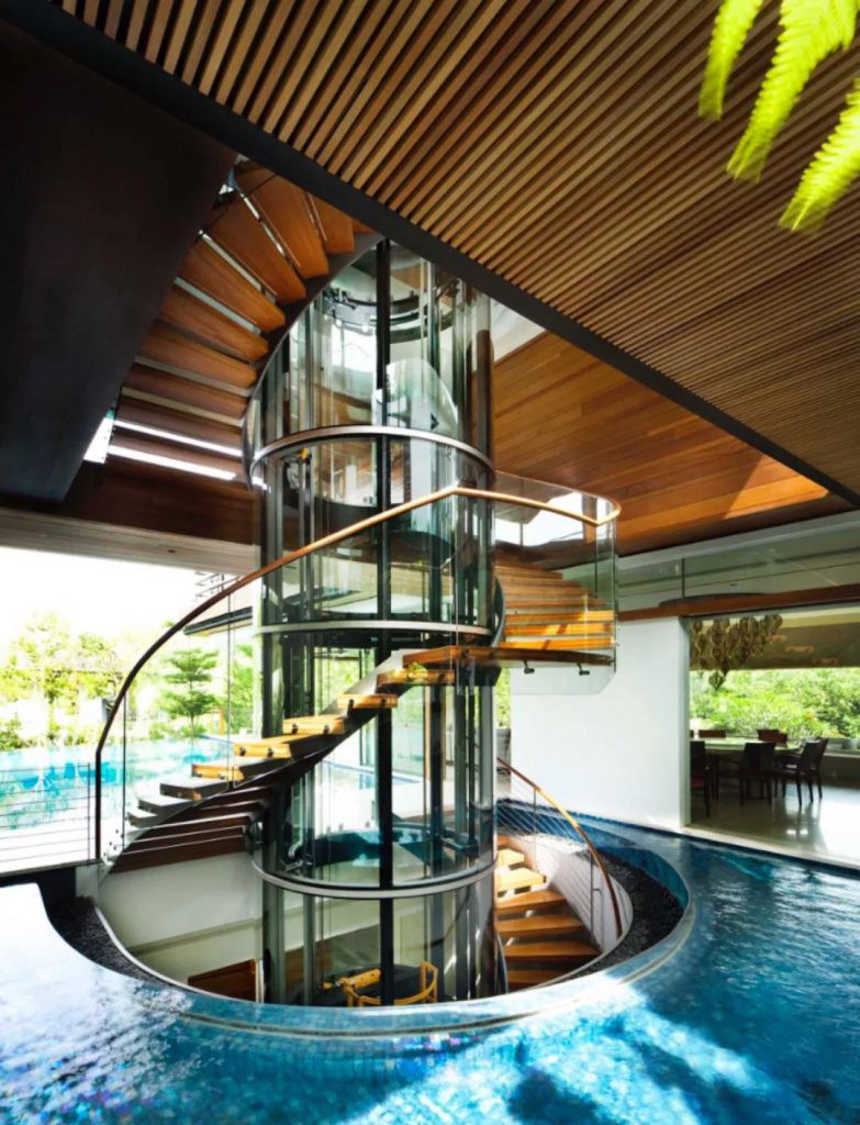 螺旋形楼梯和室内瀑布,这不就是简易版的星耀樟宜雨漩涡吗~