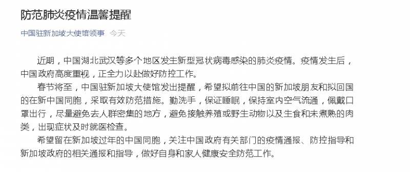 此外,今晨中国驻新加坡大使馆领事发布——防范肺炎疫情温馨提醒