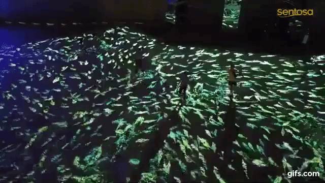 高科技的光影投射将鱼群的影响投射在细软的沙滩上