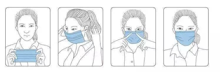 确保口罩反面朝内,有金属条的一端朝上,用双手紧压鼻梁两侧的金属条,使口罩上端紧贴鼻梁,然后向下拉伸口罩,使口罩不留褶皱,更好覆蓋鼻子、嘴巴。
