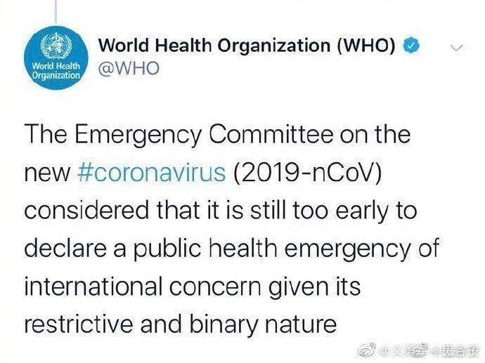 北京时间24日凌晨,世界卫生组织(WTO)在瑞士日内瓦宣布:根据紧急委员会评估,目前病毒感染疫情在中国属于紧急情况,但尚未构成国际关注的突发公共卫生事件。
