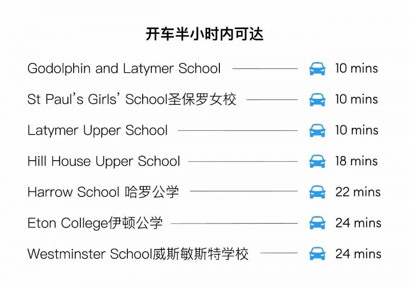伦敦多所顶尖的公立与私立学校汇聚于此,骑行16分钟就能到圣保罗男校; 开车10分钟即可至圣保罗女校。