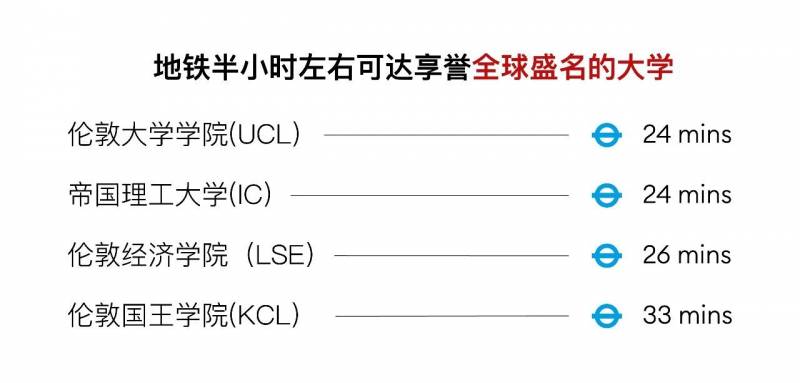 项目周边汇集了全球顶尖的教育资源,多达200多所学校,涵盖了全龄段教育。通勤30分钟内即坐落着无数小学、中学和大学,其中伦敦排名前五的大学中就占了4所。