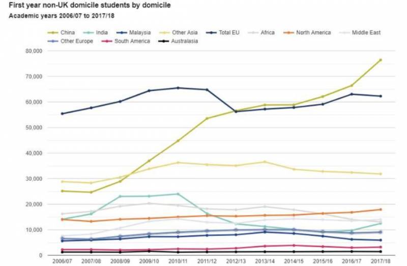 实际上,根据HESA给出的每年入学英国各大高校本科,各国留学生数量统计,中国学生的数量年年上涨,涨幅也非常惊人。(绿色折线就是中国留学生的数量)