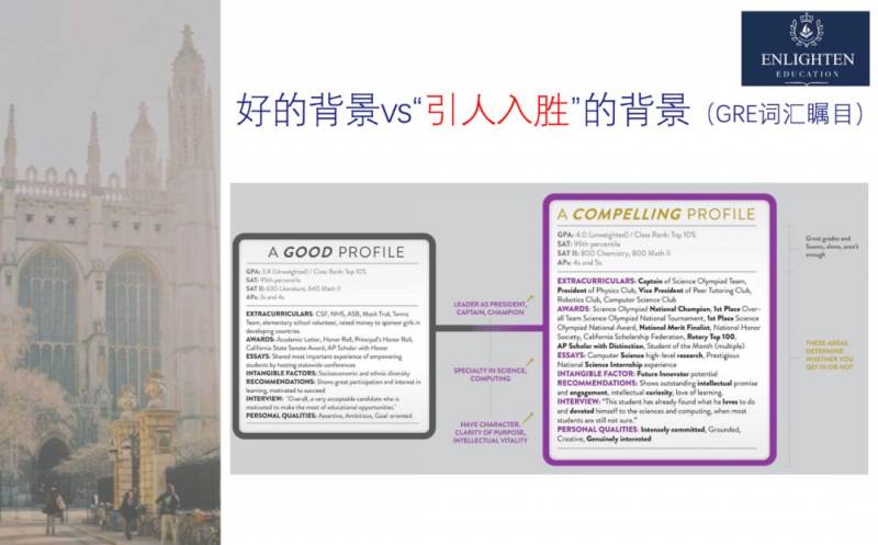 远知教育的老师,将告诉你,如何帮助孩子提升背景,从优秀到“引人入胜”,大大提高进入目标学校的几率。