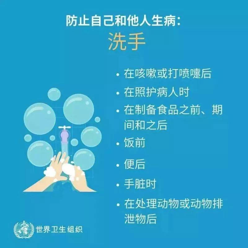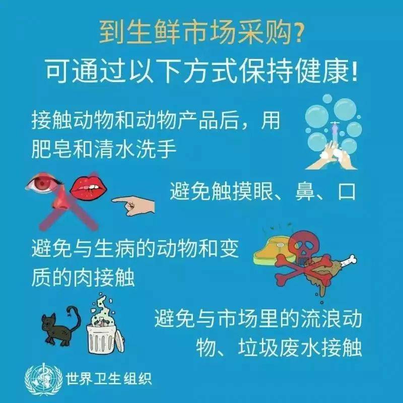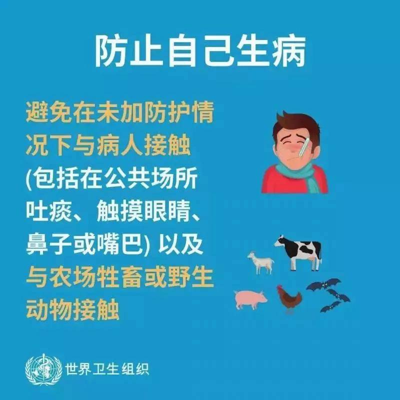 此外,年假将至,外游时更应加强注意,做足防护措施: - 避免接触动物(包括野味)、禽鸟或其粪便。 - 避免到湿货街市、活家禽市场或农场。 - 避免近距离接触患者,特别是有急性呼吸道感染症状的患者。 - 切勿进食野味及光顾有提供野味的食肆。 - 注意食物安全和卫生,避免进食或饮用生或未熟透的动物产品,包括奶类、蛋类和肉类,或食用可能被动物分泌物、排泄物(例如尿液)或产品污染的食物,除非已经煮熟、洗净或妥为去皮。 外游期间后,若发现不适,特别是有发烧或咳嗽,应戴上外科口罩,立即通知酒店职员或旅游领队,并尽快求诊。 至于若从外地返回后,若出现发烧或其他病征,应立即求诊,告诉医生最近曾到访的地方;并佩戴外科口罩,以防传染他人。 WHO对冠状病毒预防措施的指引