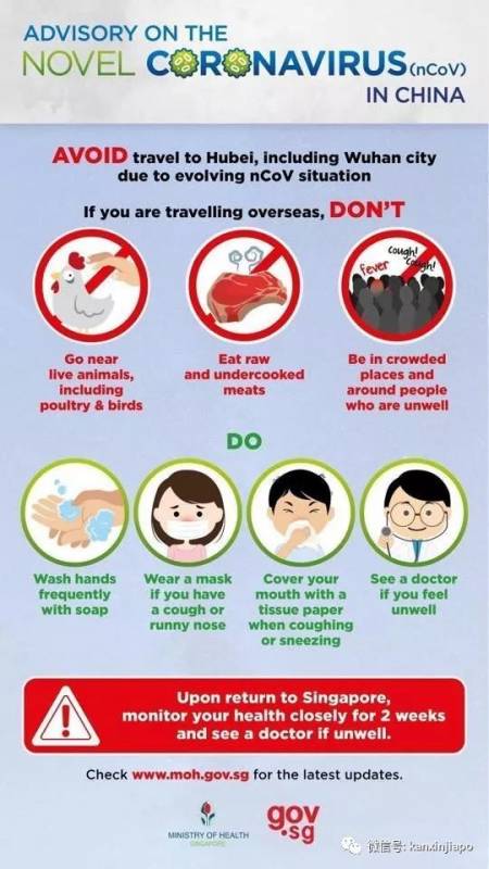 卫生部建议新加坡人避免前往整个湖北省旅行。对疫情的发展要保持镇静和警惕,定期洗手并在不适时佩戴口罩,以加强个人卫生和社会责任。新加坡卫生部也做了官方po文,呼吁在新人士面对疫情“Three Don’ts and Three Do’s ”。Three Don’ts