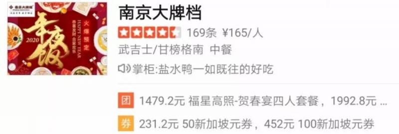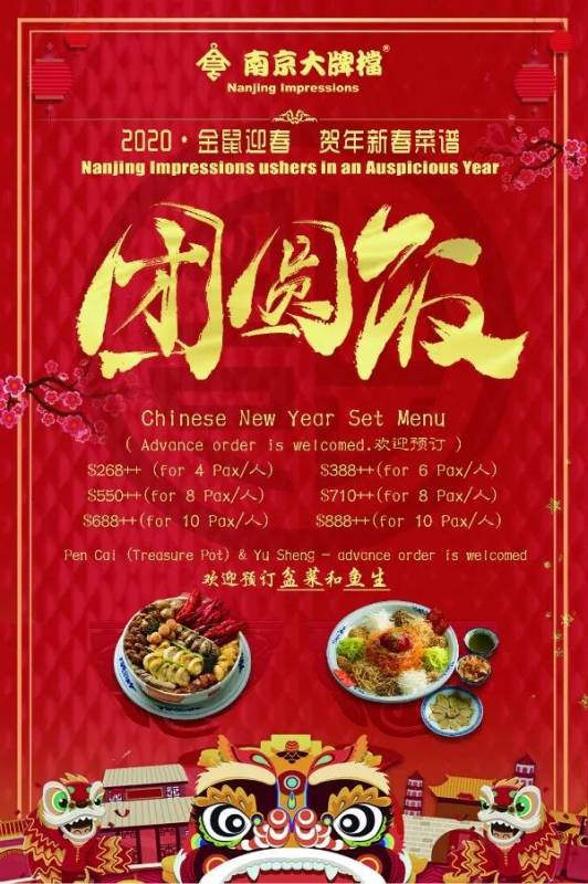 为了满足不同人数、不同价位的就餐需求,南京大排档贺春宴每桌$288++起,包含福星高照宴、花开富贵宴、招财进宝宴、盆满钵满宴四款套餐,精致缤纷菜谱任君选择!
