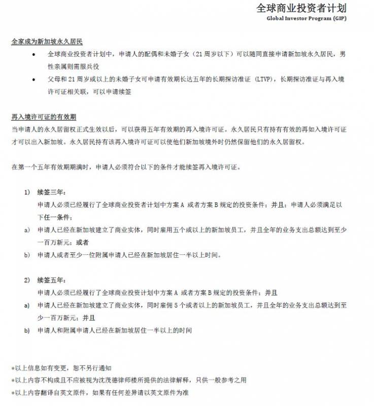 外国人投资新币250万元,可直接成为新加坡永久居民。这项计划主要是为各国企业家而制定的。目的是吸引更多的企业家来新加坡投资。投资移民申请者必须先在新加坡境内注册有限公司,然后呈交投资计划书和置业申请书。投资金可分期到位。有关投资项目至少必须经营5Year。 投资者的家庭成员,配偶和21岁以下子女,可自动成为永久居民。父母可申请亲属长期签证,在新加坡居住。子女超过21岁,需另外申请,批准机会也很大。